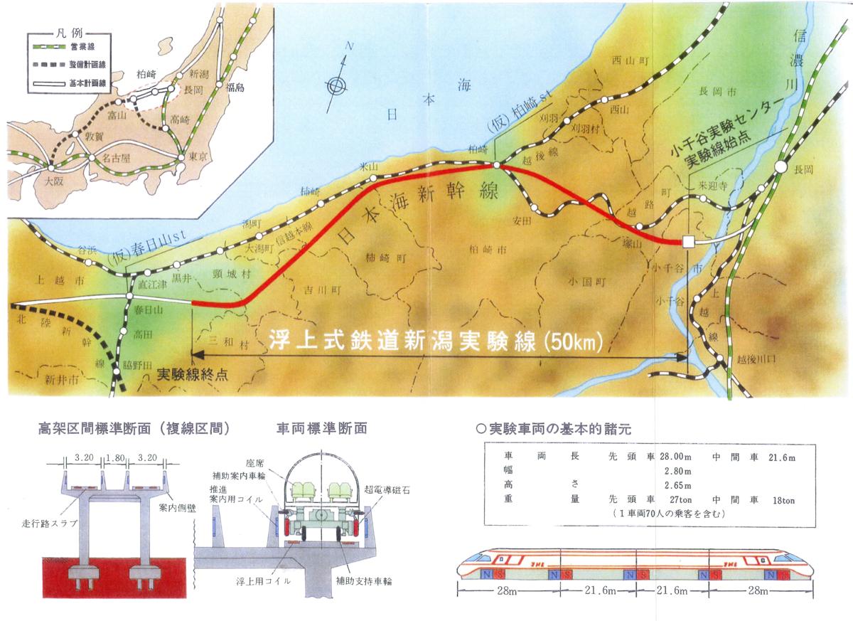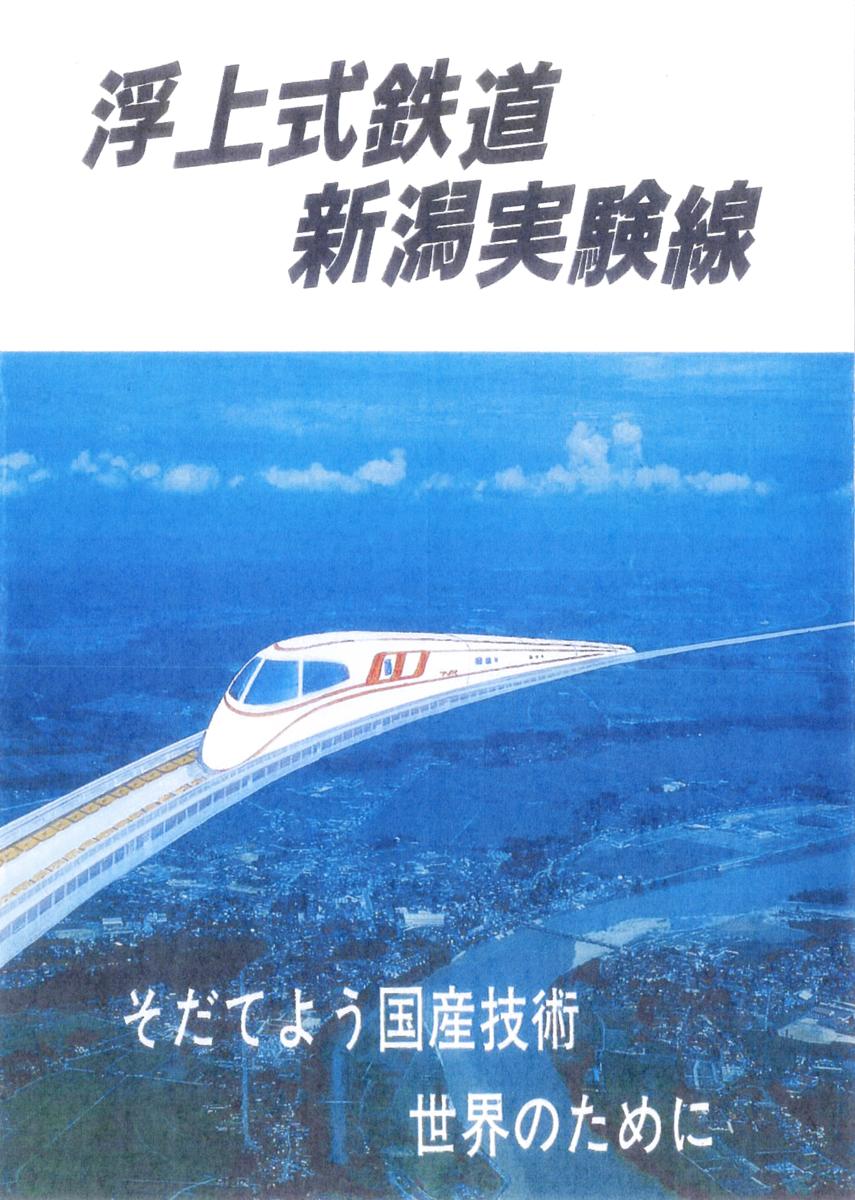 「浮上式鉄道 新潟実験線」。こんなタイトルのパンフレットの表紙には、信濃川の上空を駆け抜けるようなリニアモーターカーのイラストが描かれ、「そだてよう国産技術 世界のために」と記されている。