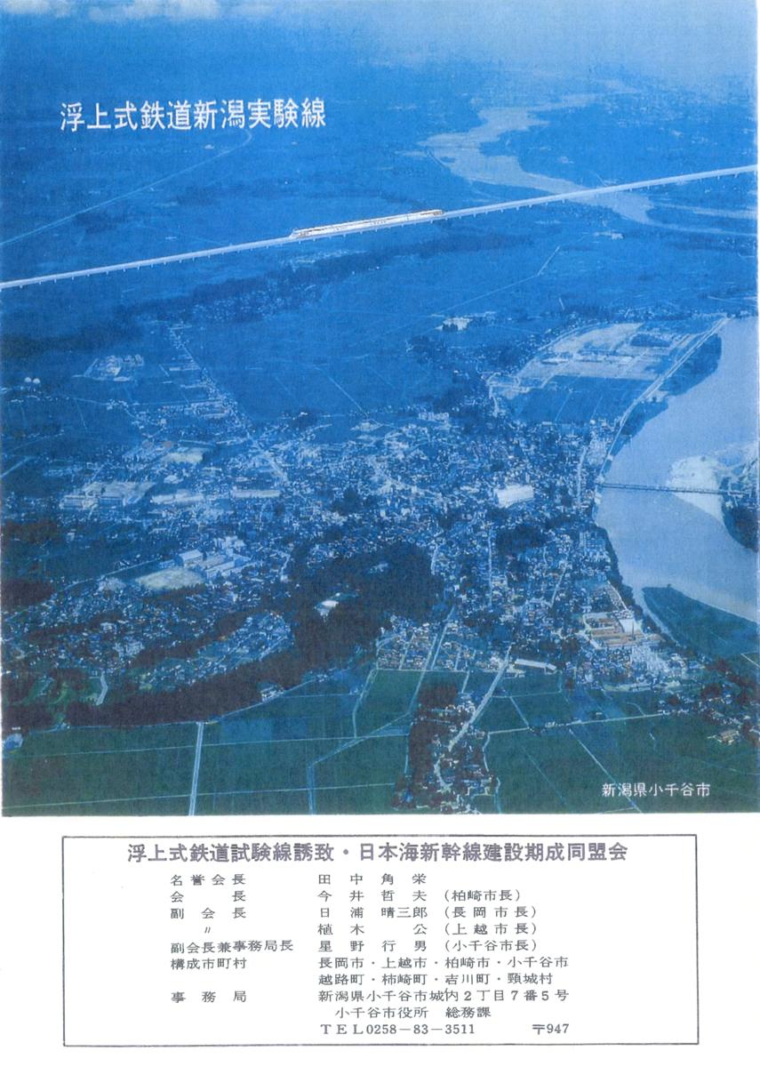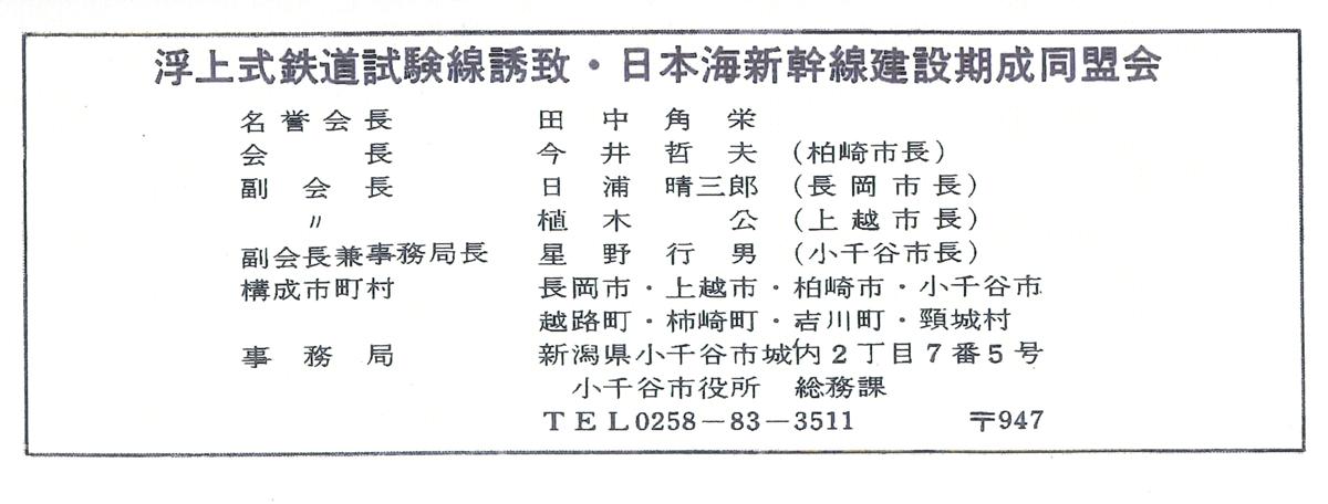 作成したのは「浮上式鉄道試験線誘致・日本海新幹線建設期成同盟会」。長岡市、小千谷市、柏崎市、上越市など沿線自治体の首長や議会、商工会議所・商工会代表らで構成されていた。会長には当時の柏崎市長が就き、副会長は長岡、上越、小千谷の各市長が担っていた。