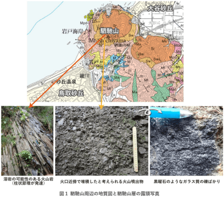 本図幅には、延べ400日を超える緻密な地表踏査に加え、化学組成分析や年代測定など多様な手法を組み合わせて得られた情報が集約されています。特に、日本海形成期の地層である中新統・北但層群については、日本海形成に伴って本地域が陸上環境から浅海・深海へと移行し、その後再び陸上環境へ戻った急激な環境変化と、同時期の活発な火山活動について、明瞭な時系列関係を示しました。なかでも、鳥取市と岩美町の境界に位置する駟馳山では、日本海形成末期に陸上で形成された火山噴出物を見いだし、駟馳山層と記載しました(図1)。これにより、鳥取地域でははじめて、日本海形成に伴って深海化したのち、再び陸上環境へ戻ったことを示す地層記録の存在が示されました(関連論文1)。