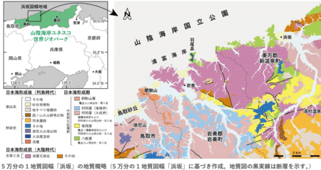 国立研究開発法人産業技術総合研究所(以下「産総研」という)は、鳥取県・兵庫県の県境に位置する浜坂地域の地質調査の結果をまとめた5万分の1地質図幅「浜坂」(以下「本図幅」という)を刊行しました。鳥取県東部から京都府北部に広がる山陰海岸ユネスコ世界ジオパークおよび山陰海岸国立公園の指定域における5万分の1地質図幅の刊行は47年ぶりとなります。