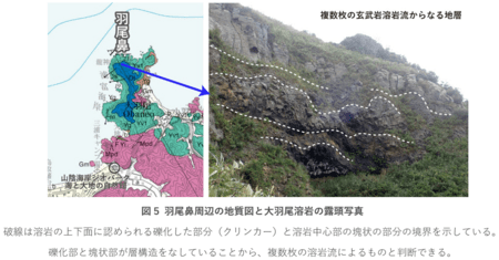 加えて、鳥取市の摩尼山では、これまで認識されていなかった約330万年前の火山の痕跡を見いだし、これを摩尼火山と命名しました(図4)。また、岩美町の羽尾鼻周辺に分布する玄武岩が約430万年前の溶岩であることを明らかにし、大羽尾溶岩と命名しました(図5、関連論文3)。兵庫県の湯村温泉周辺では、照来層群のカルデラ形成に先立つ火山活動を示す地層を識別し、湯層と命名しました。これらをはじめ、日本海形成前後に関わる多くの新知見が得られたことで、本図幅は山陰海岸ユネスコ世界ジオパーク域の大地の成り立ちに新たな理解を加えるものとなりました。