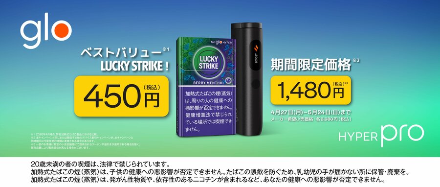 ブリティッシュ・アメリカン・タバコ・ジャパン合同会社(本社:東京都港区、代表:マウリシオ・ララ、以下「BATジャパン」)は、2026年4月27日(月)から5月24日(日)までの期間、加熱式たばこデバイス「glo™ Hyper Pro(グロー・ハイパー・プロ)」の全5カラーを対象に、期間限定の特別価格1,480円(税込)で販売するキャンペーンを実施します。