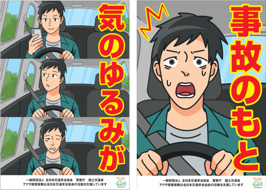 「チェンジングポスター」による交通安全啓発活動は、全日本交通安全協会にとって初の試みとなります。第一弾のテーマは「気のゆるみが事故のもと」です。このポスターは、見る角度によってドライバーの表情が「気のゆるんだ状態」から「事故寸前の切迫した状態」へと変化する視覚的な仕掛けが特徴です。これにより、スマートフォン操作や眠気など、誰もが陥りやすい運転中の油断が、いかに危険な状況に直結するかを強く訴えかけます。
