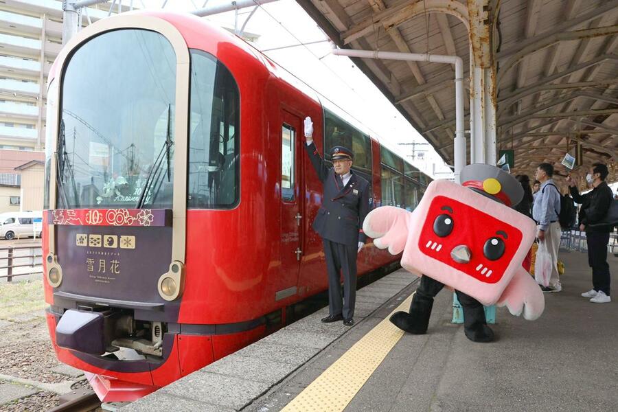 第三セクター鉄道のえちごトキめき鉄道(上越市)のリゾート列車「雪月花」が23日、運行開始10周年を迎え、上越市の直江津駅で記念セレモニーが行われた。記念のロゴマークが入った特別便を運行し、鉄道ファンや関係者ら約40人が節目を祝った。