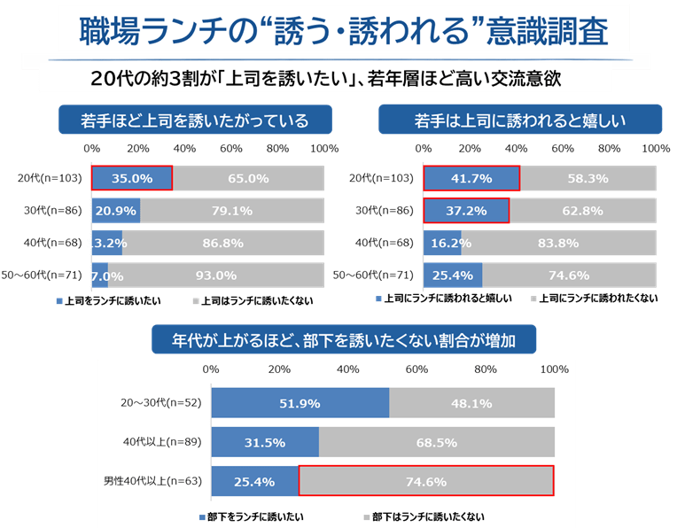 一方、上司世代にあたる40代以上では、自ら声をかけることに対して慎重な姿勢が見られた。「部下をランチに誘いたくない」とする割合は男性40代以上で74.6%に達した。背景には、ハラスメントへの配慮や、部下の負担になりたくないという意識もあると考えられる。
