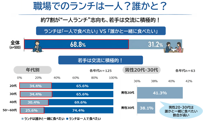 全体として「一人ランチ」志向が強まる一方で、若年層においては、ランチを社内コミュニケーションの機会として積極的に活用したい意向がうかがえる。