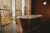 Bathhouseに足を踏み入れると、来場者は、空間の焦点となる銅製シュラウドで再解釈された、Kohlerを象徴する置き型の鋳物ホーロー浴槽の新たな表現である「Reverie」に出会います。少なくとも80%の再生素材で作られた鋳物ホーロー浴槽を包み込むこのシュラウドは、長く使い続けられるよう設計された持続可能なクラフトマンシップの系譜を際立たせています。これは、Kohlerが浴槽デザインにおいて銅を決定的な素材として用いる初めての試みであり、この分野に新たな次元をもたらします。
