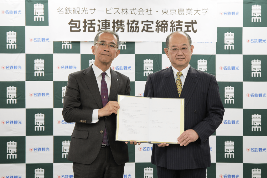 (写真左から、名鉄観光サービス代表取締役社長の岩切 道郎、東京農業大学 学長の江口 文陽)