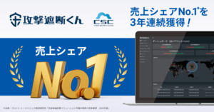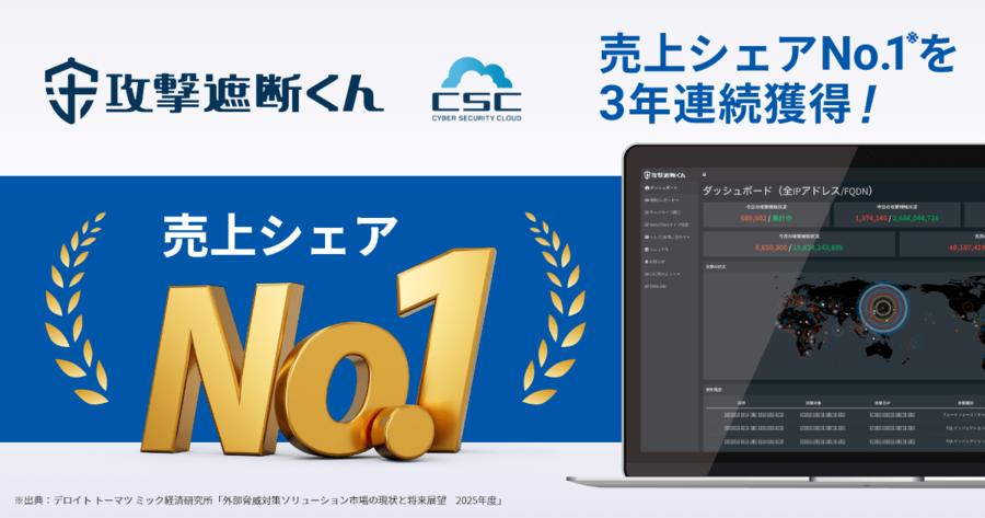 グローバルセキュリティメーカーの株式会社サイバーセキュリティクラウド(本社:東京都品川区、代表取締役社長 兼 CEO:小池 敏弘、以下「当社」)が開発・提供するクラウド型WAF『攻撃遮断くん』は、デロイト トーマツ ミック経済研究所株式会社が発表した「外部脅威対策ソリューション市場の現状と将来展望 2025年度」において、Webアプリケーションファイアウォール(SaaS・クラウド部門)の2024年度出荷金額実績でNo.1(※1)を獲得し、3年連続で売上シェアNo.1となりましたことをお知らせします。