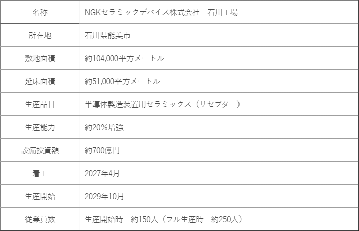 また、現状では半導体製造装置用セラミックスの生産拠点が東海地方に集中していることから、今回の石川新工場の設立は、供給体制の強靭化を図るBCP(事業継続計画)の観点からも重要な拠点と位置づけています。