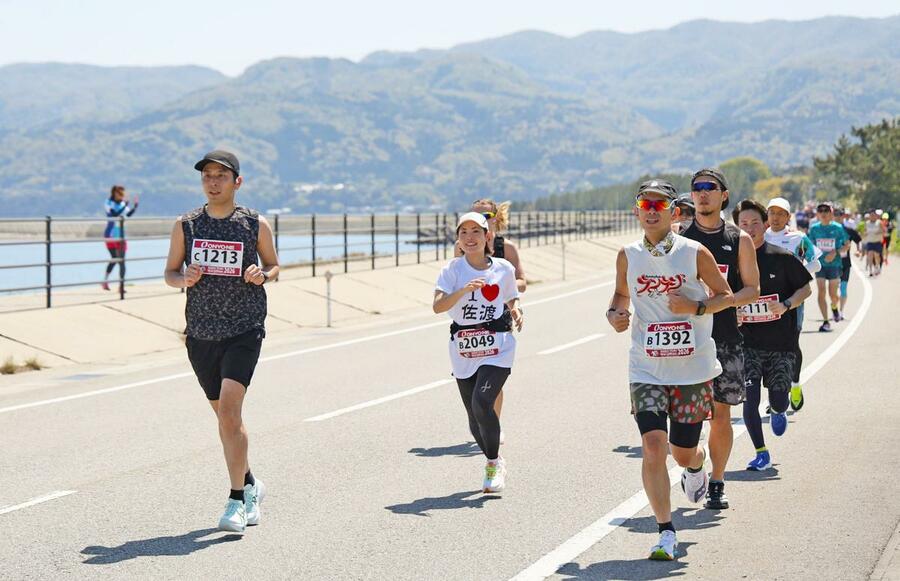 春の佐渡路を駆け抜ける「佐渡トキマラソン」が25、26の両日、佐渡市両津湊のおんでこドームを発着に行われた。青空が広がる絶好のランニング日和に、県内外から集まった約2200人が自然あふれるコースを快走した。