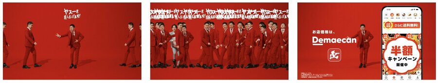 「超ゴイゴイヤスー祭」の圧倒的な安さを、ダイアン・津田さんの持ちネタである「スーを差し上げます」と絡めて「ヤスーを差し上げます」で、ダイアン・津田さんとドンデコルテ・渡辺さんが体現。画面一杯に増殖して伝える“ヤスー”が見どころです。