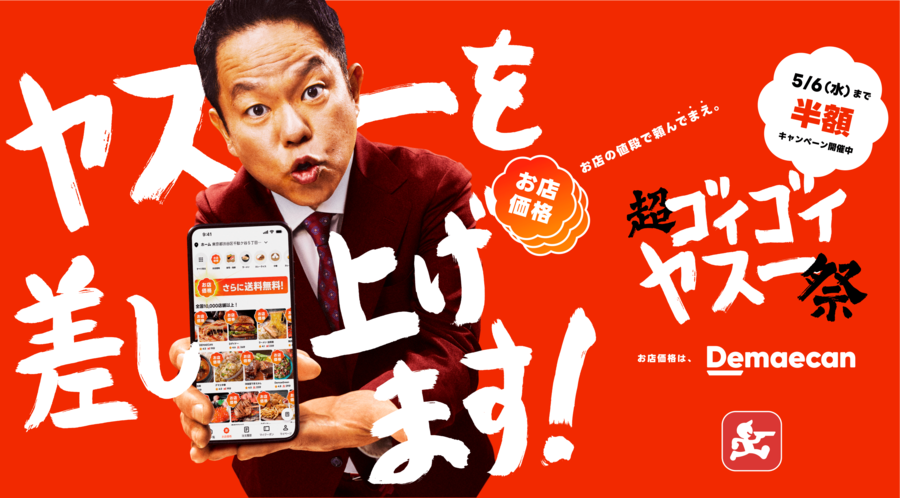 「超ゴイゴイヤスー祭」は、そのネーミングの通り、「ものすごい(ゴイゴイ)」と「安い(ヤスー)」という2つのメッセージを込めた出前館史上最大級のゴールデンウィークキャンペーンです。デリバリーを日常の選択肢として定着させるため、究極の利便性と驚きのおトクさをご提供します。