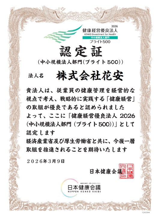 株式会社花安は、経済産業省および日本健康会議が認定する「健康経営優良法人認定制度」において、以下の通り認定を取得いたしましたことをお知らせいたします。