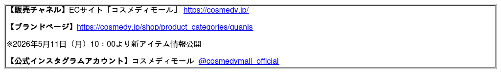 コスメディ製薬株式会社(本社:京都市/代表取締役社長:権 英淑)は2026年5月11日(月)より、スキンケアシリーズ『QUANIS(クオニス)』の新4アイテムをECサイト「コスメディモール」で順次販売を開始しますのでお知らせします。
