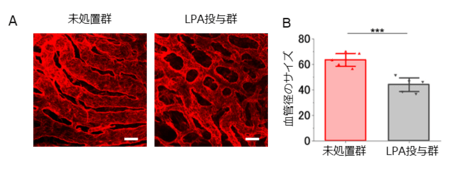 アレルギー性鼻炎のマウスにLPAを投与したところ、炎症によって広がっていた鼻の血管が正常なサイズに縮小しました。(A)血管内皮細胞のマーカーであるエンドムチンを免疫染色した鼻腔内血管の顕微鏡画像(左:未処置群、右:LPA投与群)。赤く染まった部分が血管で、LPAの投与によって血管が細くなっていることが視覚的に確認できます。(B)血管の太さを数値で比較したグラフ。LPA投与群では統計的に有意な血管径の縮小効果が確認され、アレルギー性鼻炎の症状の改善につながる新しい治療法の可能性を示しています。