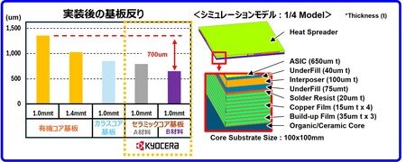 本基板は、高密度配線が可能で基板剛性に優れた独自のセラミック材料を活用することで、先端半導体パッケージ実装時の反りの低減を実現します。