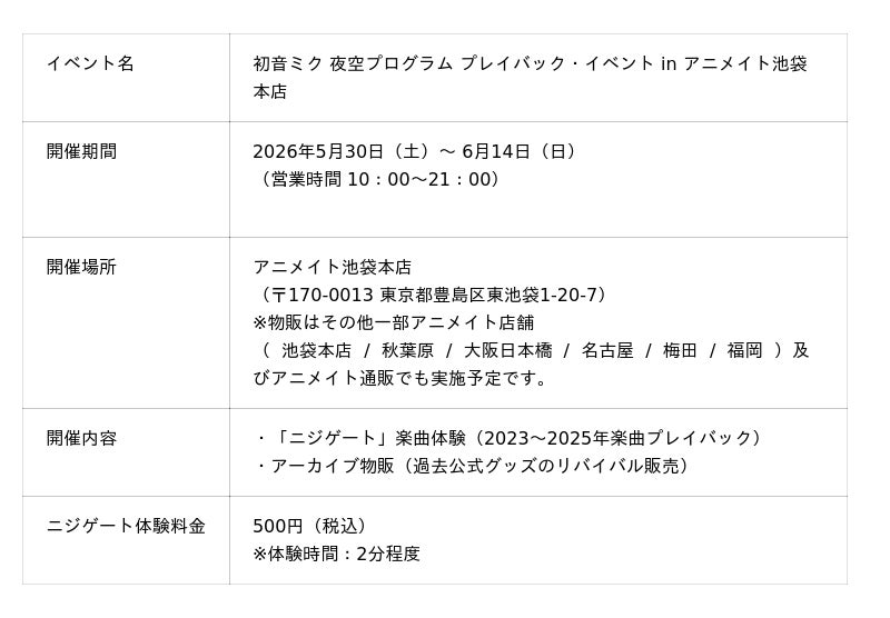 4年目を迎える本年度は「夜空×フェス」をテーマに掲げ、9月の開催に向けた様々な展開を予定しております。開催決定を記念し、2023年から2025年までの活動を振り返るプレイベント「初音ミク 夜空プログラム プレイバック・イベント in アニメイト池袋本店」を、2026年5月30日(土)より開催いたします。