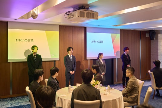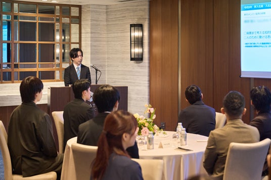 入社式では、新卒社員の採用経緯や会社のこれまでの歩みが紹介されるとともに、昨年入社した先輩社員の取り組みや成長についての発表が行われました。