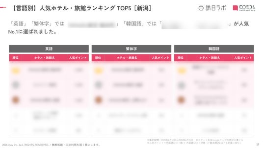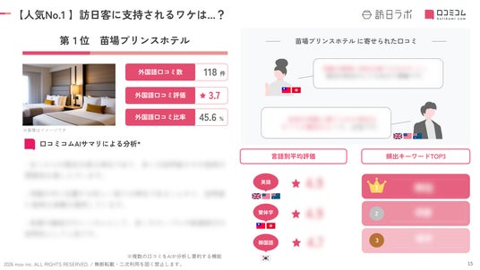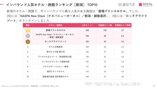 業界最大級のインバウンドビジネスメディア「訪日ラボ」及び 店舗向け集客一元化プラットフォーム「口コミコム」を運営する株式会社mov(代表取締役:渡邊 誠、本社:東京都渋谷区、以下mov)は、新潟県のホテル・旅館に寄せられた最新の口コミデータから、独自の『インバウンド人気ホテル・旅館ランキング』を発表しました。