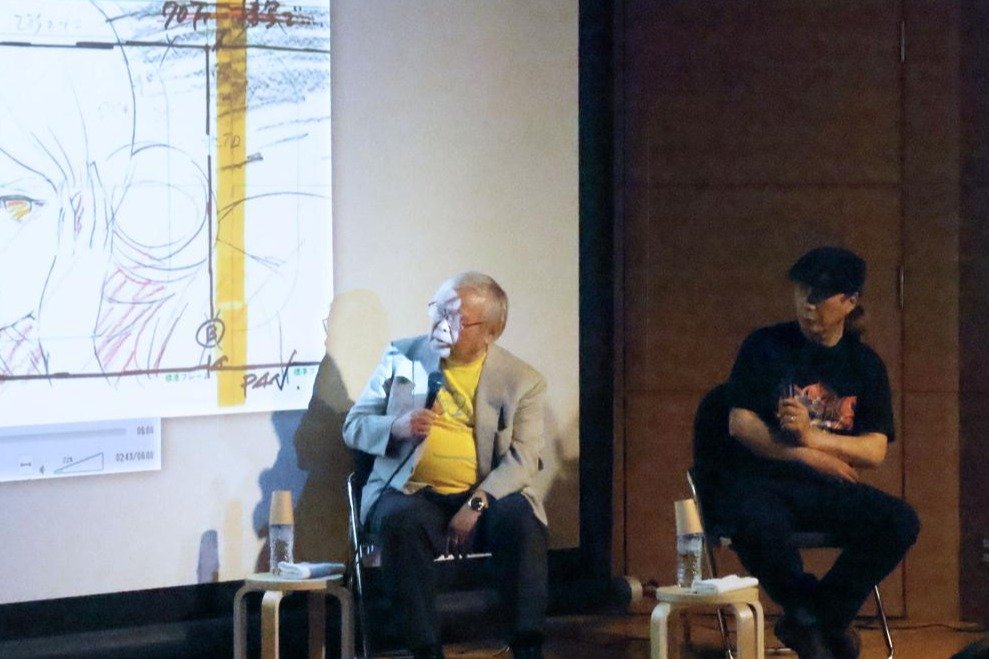 スクリーンを見ながら、キャラクターについて解説する安彦良和さん(左)