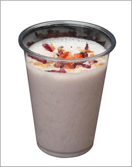 特長:1日に必要とされる果物の目標摂取量(200g)の約1/3日分に当たるいちご85gを使用したラッシーです。