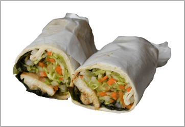 特長:1日に必要とされる野菜の目標摂取量(350g)の約1/3日分に当たる野菜120gを使用したサラダラップです。キャベツや水菜のシャキシャキとした食感を楽しむことができます。具材の中心にはスパイスを効かせたタンドリーチキンを使用しています。香ばしく焼き上げたチキンとみずみずしい野菜の食感が味わえる、食べ応えある一品です。