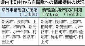 自衛官の募集を目的に、防衛省は自治体から、就職期を迎える住民の情報の提供を受けている。これに対し、住民側が拒否の意思を示すことができる「除外申請制度」を設けている自治体が、県内30市町村のうち10市町にとどまることが27日、新潟日報社のまとめで分かった。国際情勢の不安定化で防衛問題への関心が高まる中、保護者や法律家からは「提供してほしくないと考える人の権利も確保すべき」との声が上がる。