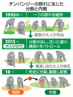 人間に見られる集団暴力は民族や宗教といった文化の違いに根ざしているのか、人間関係が不安定化するだけでも発生するのかが議論となっている。チンパンジーは人間に最も近い種の一つ。今回の観察は、文化の違いがない条件でも内戦に至る可能性を示した。成果は米科学誌サイエンスに掲載された。