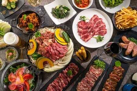 柔らかサフォーククロスラム肩ロース〈プラン外〉、生ラム、味付きラム、さっぱり塩ラム、ピリ辛ジンギスカン、しょうゆホルモン、ビックフランク、焼き野菜、旭川近郊トマトサラダ 白ユーリンソース、ジューシー蒸し鶏の棒々鶏仕立て、タコザンギ、モッツァレラチーズスティック春巻き、気仙沼産マグロカツ ハバネロチリソース、特製揚げ餃子 ユーリンソース、冷たい蕎麦、俵むすび〈プランのみ提供〉、北海道美瑛牛乳ソフトクリーム、他7品
