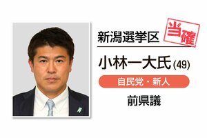 【速報・参議院選挙】小林一大氏が当選確実、新潟選挙区 2022/7/10 21:32 (最終更新: 2022/7/10 21:32) 10日に行われた参議院選挙の新潟選挙区で、自民党新人の小林一大(こばやし・かずひろ)氏(49)の当選が確実となった。2016年に改選1議席になってから、自民党候補が勝つのは初めて。 トップページで最新情報を見る 関連ニュース 新潟県選管、参議院選挙の「投開票速報」を訂正 2022/7/14 連載[参議院選挙新潟選挙区・分水嶺の激闘]<下>立民 野党間... 2022/7/13 参院選、自民8年ぶり上越市で勝利 240票差、与野党勢力図に変化も 2022/7/13 参議院選開票結果、「衆議院新区割り」だとどうなる? 新潟選挙... 2022/7/13 立民西村幹事長、共闘へ溝埋められず 参院選で議席減 2022/7/13 連載[参議院選挙新潟選挙区・分水嶺の激闘]<上>自民 挙党態... 2022/7/12 参議院選挙比例代表で落選の水落敏栄氏、引退撤回から挑むも支持... 2022/7/12 参院選新潟選挙区 無党派層が勝敗左右か 戦いを振り返る 2022/7/11 安倍元首相銃撃事件後、小林氏の得票増 参院選・期日前出口調査 2022/7/11 柏崎刈羽原発再稼働「反対」減少も4割超 「賛成」は増加 参院... 2022/7/11 比例代表個人名得票 公明・竹内真二氏がトップ 参院選・新潟県内 2022/7/11 比例代表政党名得票 自民が全市町村で最多 参院選・新潟県内 2022/7/11