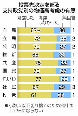 政治・行政 選挙 参院選2022 67・2%「物価高を考慮」 参議院選挙・全国出口調査 2022/7/11 13:17 (最終更新: 2022/7/11 14:16) 共同通信社は参院選で、全国の有権者に投票した候補者や政党を質問する出口調査を実施した。物価高の影響や選挙協力の効果、無党派層の動向、年代別・男女別の投票行動などを分析した。... 残り685文字(全文:772文字) ここから先を読むには 続きを読む(会員登録する) 続きを読む(ログイン) 新潟日報朝刊を購読していますか? はい いいえ トップページで最新情報を見る 関連ニュース 新潟県選管、参議院選挙の「投開票速報」を訂正 2022/7/14 連載[参議院選挙新潟選挙区・分水嶺の激闘]<下>立民 野党間... 2022/7/13 参院選、自民8年ぶり上越市で勝利 240票差、与野党勢力図に変化も 2022/7/13 参議院選開票結果、「衆議院新区割り」だとどうなる? 新潟選挙... 2022/7/13 立民西村幹事長、共闘へ溝埋められず 参院選で議席減 2022/7/13 連載[参議院選挙新潟選挙区・分水嶺の激闘]<上>自民 挙党態... 2022/7/12 参議院選挙比例代表で落選の水落敏栄氏、引退撤回から挑むも支持... 2022/7/12 参院選新潟選挙区 無党派層が勝敗左右か 戦いを振り返る 2022/7/11 安倍元首相銃撃事件後、小林氏の得票増 参院選・期日前出口調査 2022/7/11 柏崎刈羽原発再稼働「反対」減少も4割超 「賛成」は増加 参院... 2022/7/11 比例代表個人名得票 公明・竹内真二氏がトップ 参院選・新潟県内 2022/7/11 比例代表政党名得票 自民が全市町村で最多 参院選・新潟県内 2022/7/11