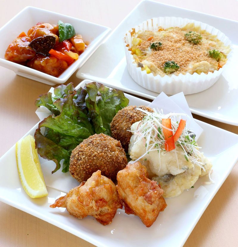 まずは2枚の写真を見てほしい。上はカフェのキッズプレートやクリームソーダ、下は揚げ物や酢豚など総菜店の商品だ。おなじみの品々のようだが、普通のメニューとは決定的な違いがある。