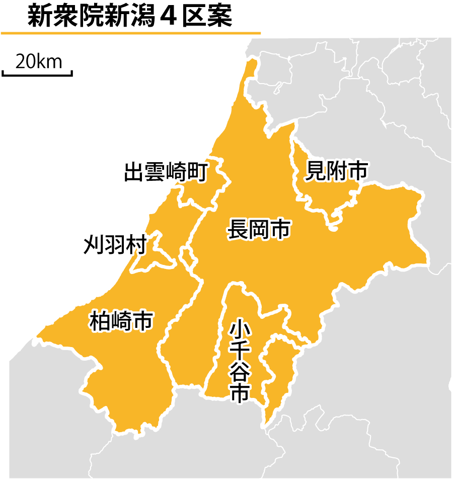 衆院選の新たな区割り案による新潟県の新4区には、現2、4、5区に分かれている長岡市、現2区の柏崎市、出雲崎町、刈羽村、現4区の見附市、現5区の小千谷市が入る。現5区選出で立憲民主党会派に所属する米山隆一氏のほか、自民党は現5区から出て比例代表で復活当選した泉田裕彦氏、現2区から長岡に軸足を移した鷲尾英一郎氏(比例北陸信越)がそれぞれ新4区で活動する方針。与野党対決に加え、自民内の候補者選定が焦点だ。