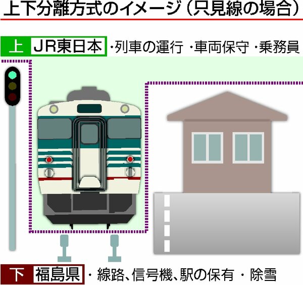 上下分離方式は列車の運行を「上」、線路や施設の維持・管理を「下」と位置付け、「上」をJRや第三セクターなどの鉄道会社、「下」を地元自治体などが担う運営方式だ。