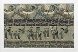 戦争プロパガンダの主なターゲットは、実際の戦力として期待された男性や少年だった。しかしこの帯は女性用だ。どんな色とも相性の良い淡いベージュ地の上を、武装した軍隊が行進する。兵士たちの軍服の裾や帽子の飾り、掲げている国旗や機関銃に細かい刺しゅうがあしらわれている。