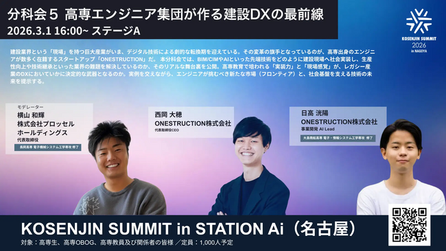 3/1開催「KOSENJIN SUMMIT 2026」の分科会「高専エンジニア集団が作る建設DXの最前線」にプロッセルホールディングス代表の横山が登壇
