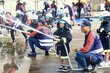 的に向かって放水、気分はすっかり消防士 新発田で「幼年消防ふれあい広場」。煙の中歩く体験も