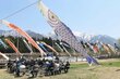 残雪の巻機山を背景に泳ぐ100匹のこいのぼりたち♪ 南魚沼市の滝谷農村公園で5月6日まで