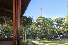 手入れの行き届いたクロマツに支柱を添え、庭師が枝に縄を結んでいく。青空が広がった今月12日、常緑樹が多い新潟市文化財「旧小澤家住宅」(中央区上大川前通12)の和風庭園では冬囲いの「雪つり」作業が行われた。厳しい冷え込みが近づく中、木々が冬の装いをまとい、雪への備えを整えた。