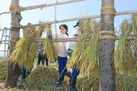 お米のカーテンみたい!新潟県上越市諏訪小児童が稲刈り、はさ掛け体験 地元住民が手ほどき