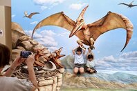 飛び立つ翼竜にギュッ!大迫力の写真パチリ♪ 新潟県上越市でトリックアート展・ 8月25日まで上越科学館