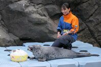 ゴマフアザラシのフタバが1歳に♪大好きな魚ケーキでお祝い・新潟上越市「うみがたり」、好奇心旺盛な人気者