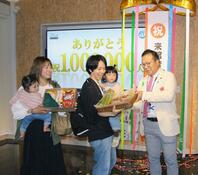 新潟五泉市「ラポルテ五泉」来館100万人達成!長岡市の家族に記念品 開館から2年6カ月、年間目標25万人を大幅クリア