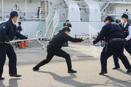 佐渡海上保安署や佐渡署などは、佐渡市の小木港で国際クルーズ船寄港時のテロを想定した合同訓練を行った。不審者の制圧や負傷者の搬送など、緊急時の動きを確認し、関係機関の連携を深めた。