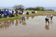 佐渡市の小倉千枚田で田植え 棚田オーナーが秋の実り願う