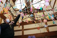 めでたいな♪天井いっぱい繭玉飾り 新潟県出雲崎町・北国街道妻入り会館で地域住民らが飾り付け