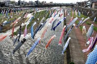 [動画あり]大空悠々ス~イスイ、泳ぐこいのぼりにタッチ♪ 新潟加茂市の加茂川に色とりどり500匹、「触れるこいのぼり」も復活!