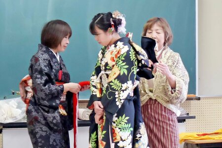 日本の文化であり、地元の産業でもある着物に関心をもってもらおうと、美容師の団体が塩沢小学校(南魚沼市塩沢)の3年生約60人に、着物に親しむ授業を行った。児童らは着物の歴史や腰ひもの結び方を学び、伝統文化の一端に触れた。