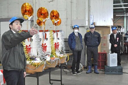 新春恒例の初競りが5日、南魚沼市川窪の地方卸売市場魚沼食品流通センターで行われた。記念式典では魚や野菜を載せた縁起物の「宝船」が登場し、商売繁盛や豊作、地域産業の発展を願った。